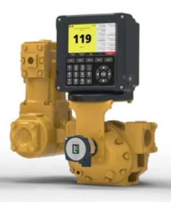 This is an example of a Liquid Controls (LC) propane meter, with an LCR2 register head mounted on it. The yellow portion is the meter itself, the blue is the register head.